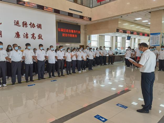 本次教育实践活动由政务服务中心分管负责同志主持,组织全体干部职工围绕政务服务行业规范的服务意识、服务仪表、服务行为、服务语言、服务承诺和服务纪律等六方面内容,重温了《天津市政务服务工作人员守则20条》《工作人员标准化服务八项内容》《窗口规范化建设十项标准》,进一步强调了“一口清”、“一次清”、“首问负责”、预约服务等工作机制,并将核心价值观融入行业规范中,不断提高审批工作的服务水平和质量。