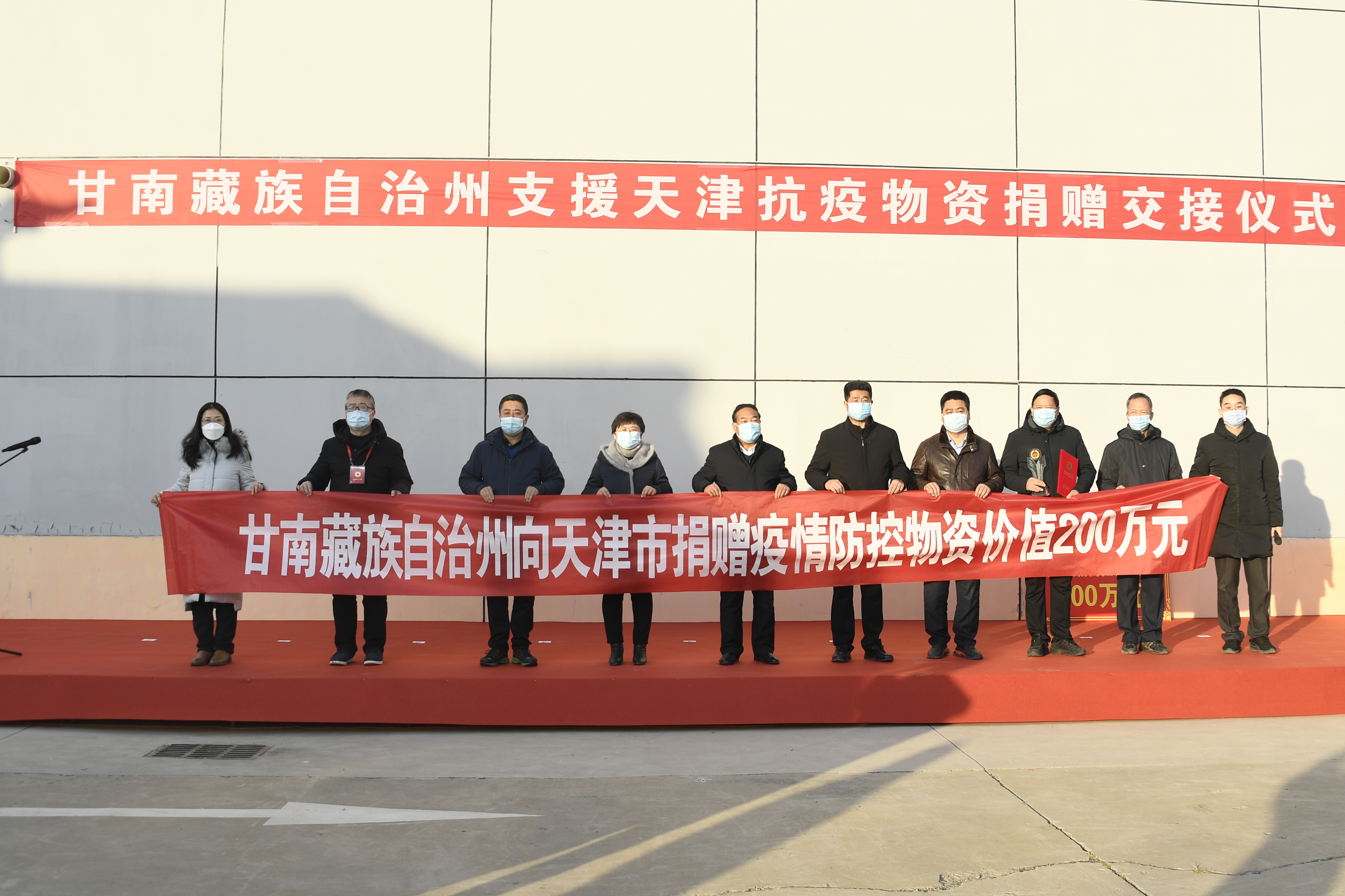 在抗疫物资交接仪式上,市红十字会赈济救护部部长代表天津市接受捐赠物资清单,并向甘南州委、州政府回赠荣誉证书及博爱奖杯。副区长吴俊雅出席。