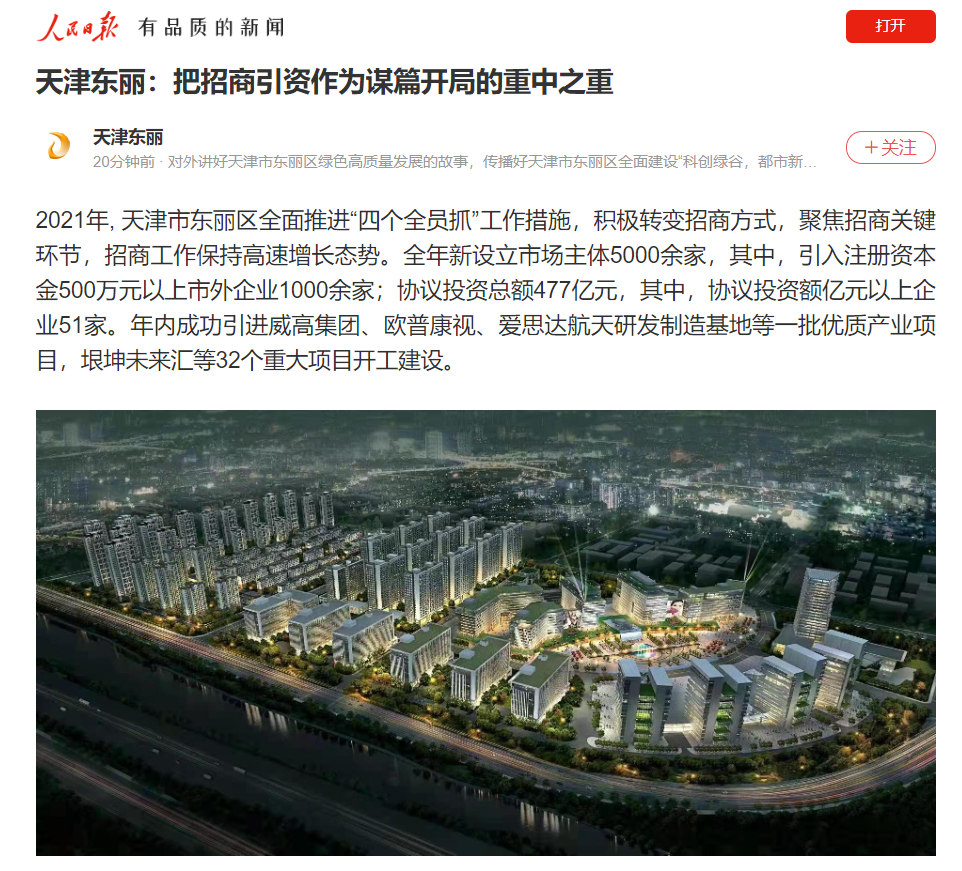 2021年, 天津市东丽区全面推进“四个全员抓”工作措施,积极转变招商方式,聚焦招商关键环节,招商工作保持高速增长态势。全年新设立市场主体5000余家,其中,引入注册资本金500万元以上市外企业1000余家;协议投资总额477亿元,其中,协议投资额亿元以上企业51家。年内成功引进威高集团、欧普康视、爱思达航天研发制造基地等一批优质产业项目,垠坤未来汇等32个重大项目开工建设。