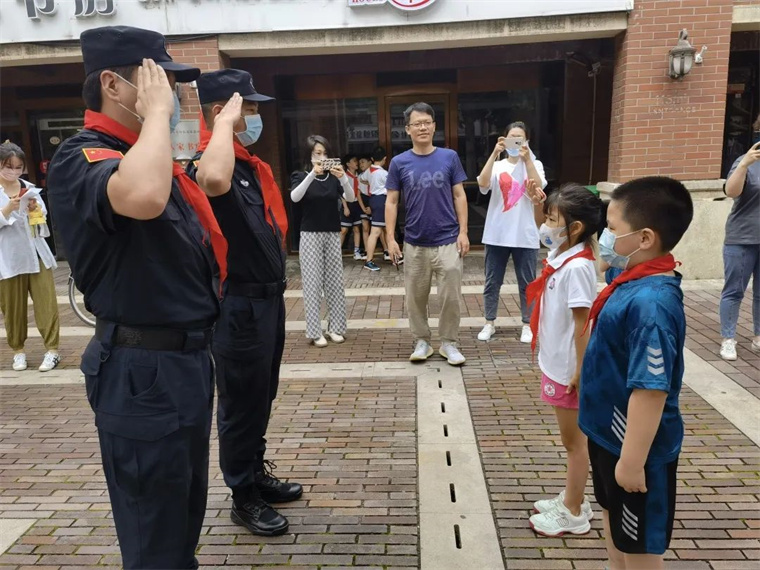 《中国少年先锋队队歌》的旋律响起,同学们激昂的歌声在广场上回荡,从歌声中听出了少先队员们激动的心情。 少先队员代表为参加此次夏令营的特警五支队的叔叔们系红领巾,表达少先队员的崇高敬意。