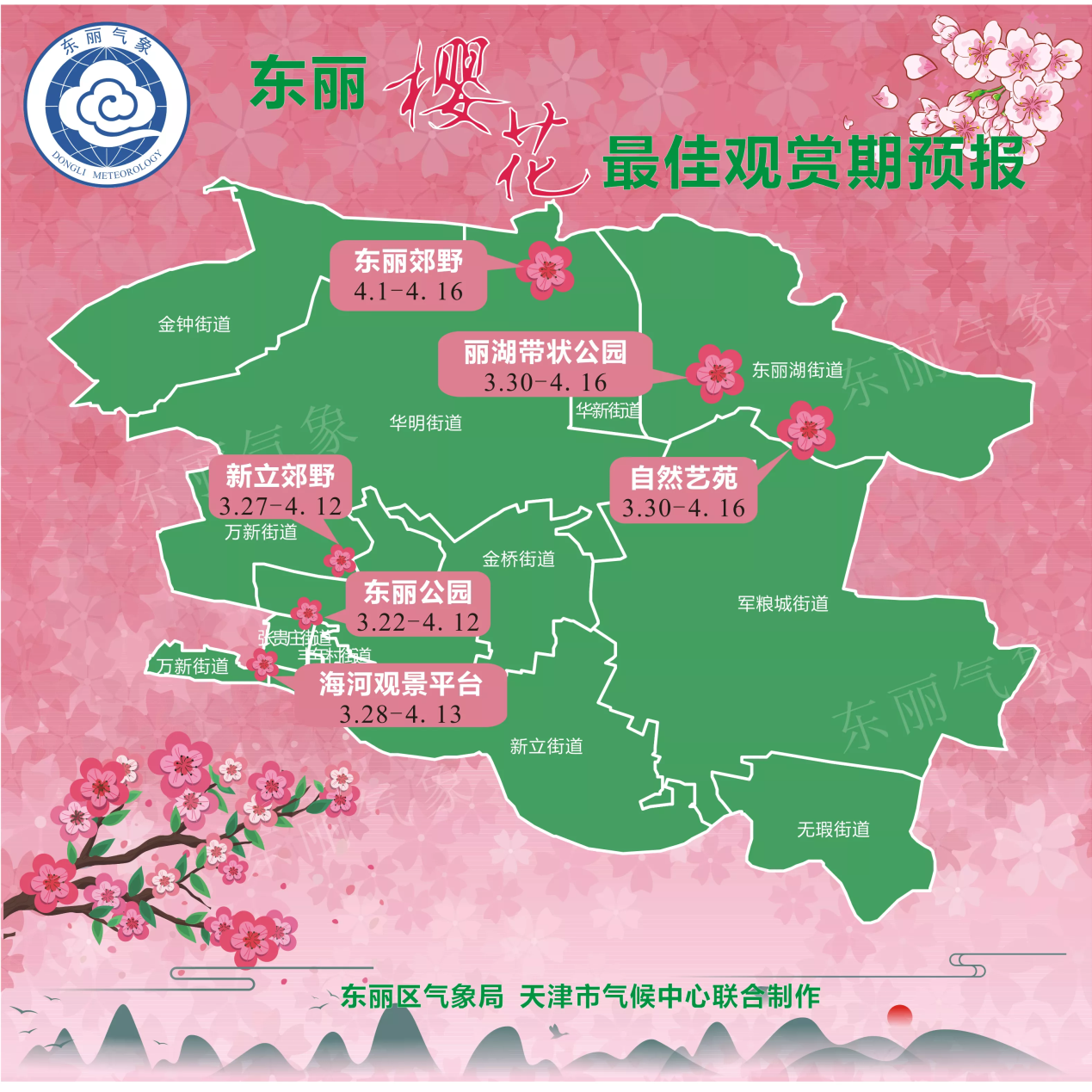 春暖花开,是踏青出游的好时节。如今,一年一度赏樱花时节到了,由于樱花种类繁多,各处赏樱时间也不尽相同。东丽区气象局联合天津市气候中心,特别制作了2023年东丽赏樱地图,让居民一目了然最佳观赏时期。快来和樱花共赴一场春日之约,来一场说走就走的樱花之旅吧!