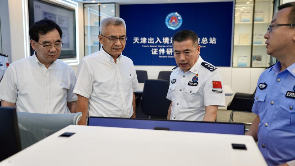 在天津出入境边防检查总站,贾堤、李春首先参观了总站指挥中心、证件研究中心、数据核查研判中心、12367服务平台等“三中心一平台”建设,听取有关情况介绍。