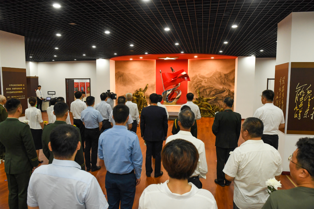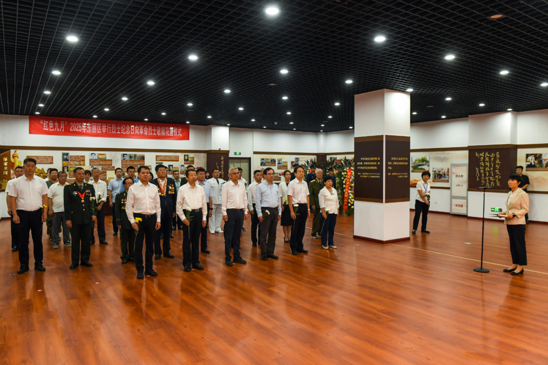 东丽区革命烈士纪念馆内,气氛庄严肃穆。现役军人代表、少先队员代表、军休干部代表、退役军人代表及社会各界人士代表,整齐列队、手持鲜花静默肃立。纪念馆中央,摆放着烈士纪念雕塑,镌刻着东丽区烈士英名录。