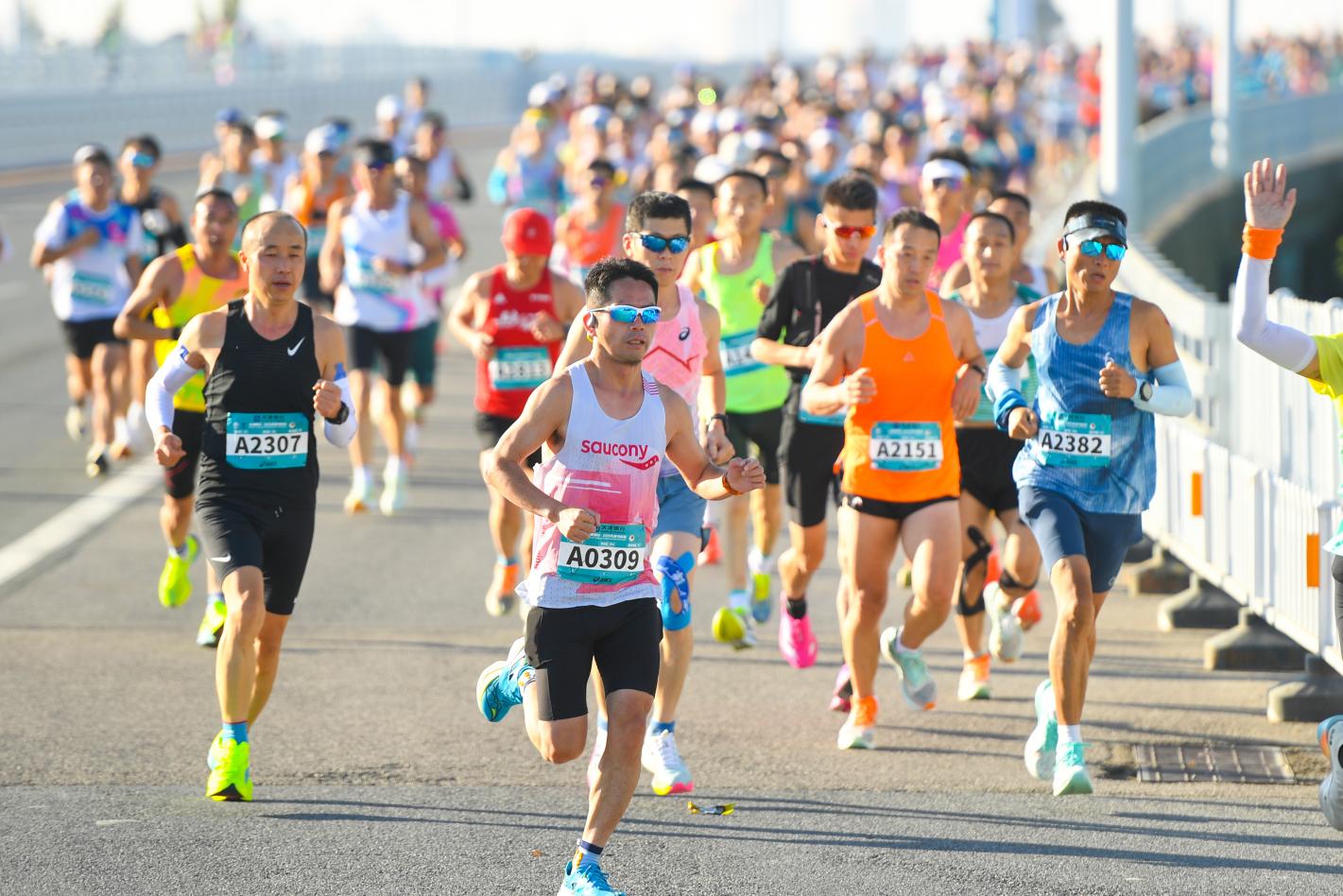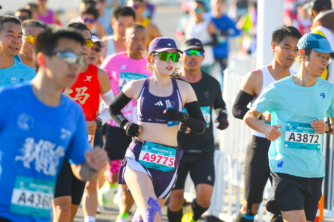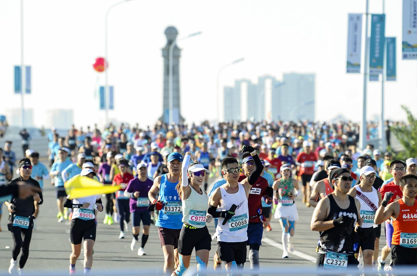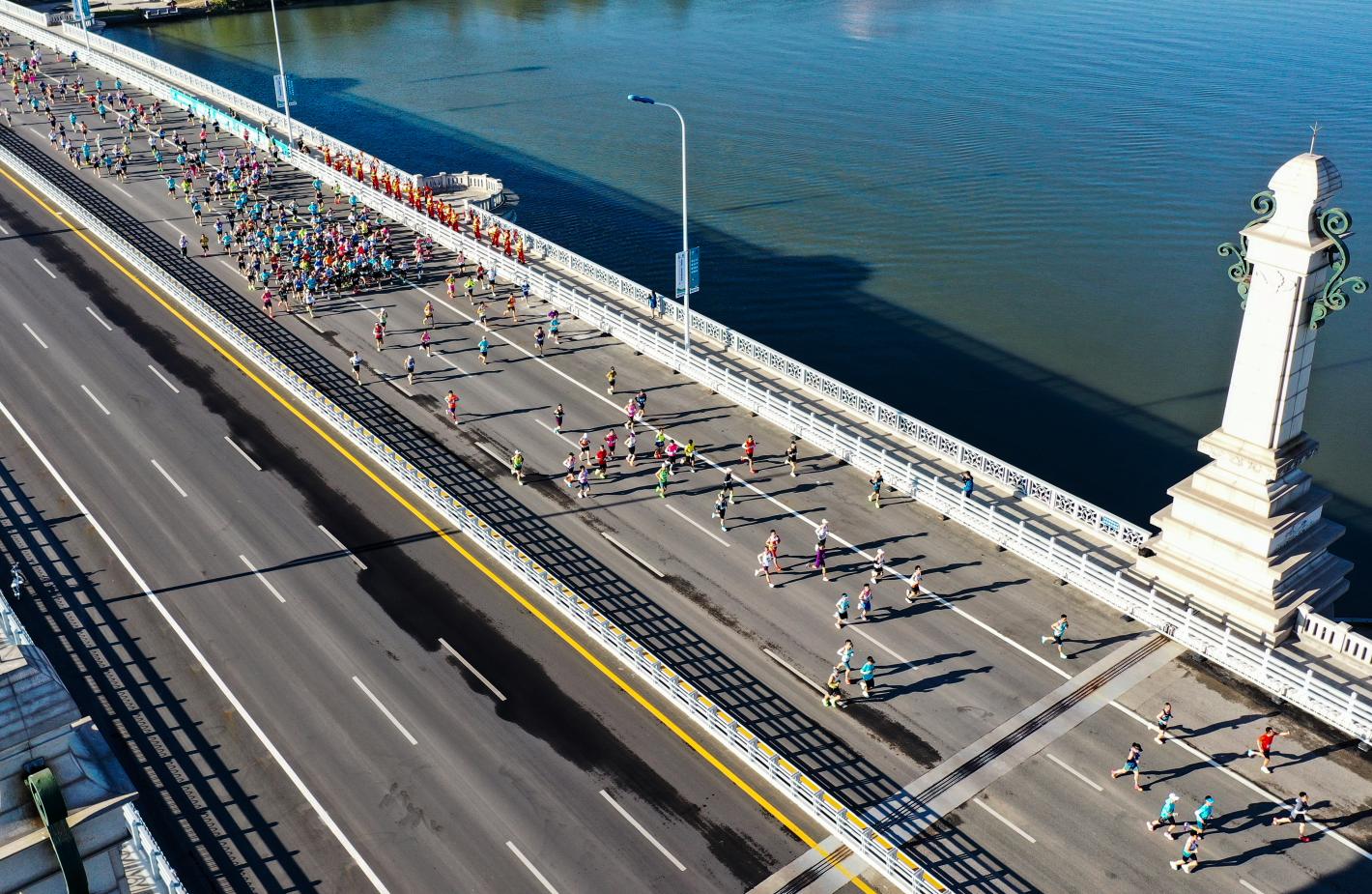 8点12分,随着第一名选手跑进东丽界域,身着各色参赛服的跑者们也相继如潮水般涌入东丽,两旁秋色斑斓的树木与沿途观众热情的欢呼声,共同点燃了这条“蓝丝带”上的奔跑激情。全马选手自鄱阳路进入东丽,依次经过春意桥、海河东路、月牙河桥后离开,赛段长约1公里,半马路线是春意桥右转海河东路再折返,赛道全长 2.3公里。