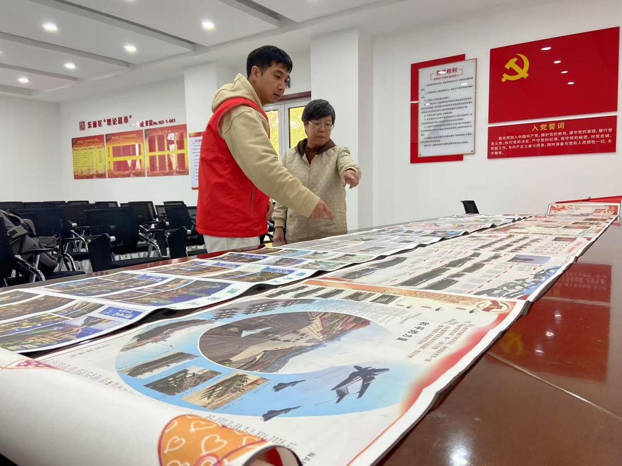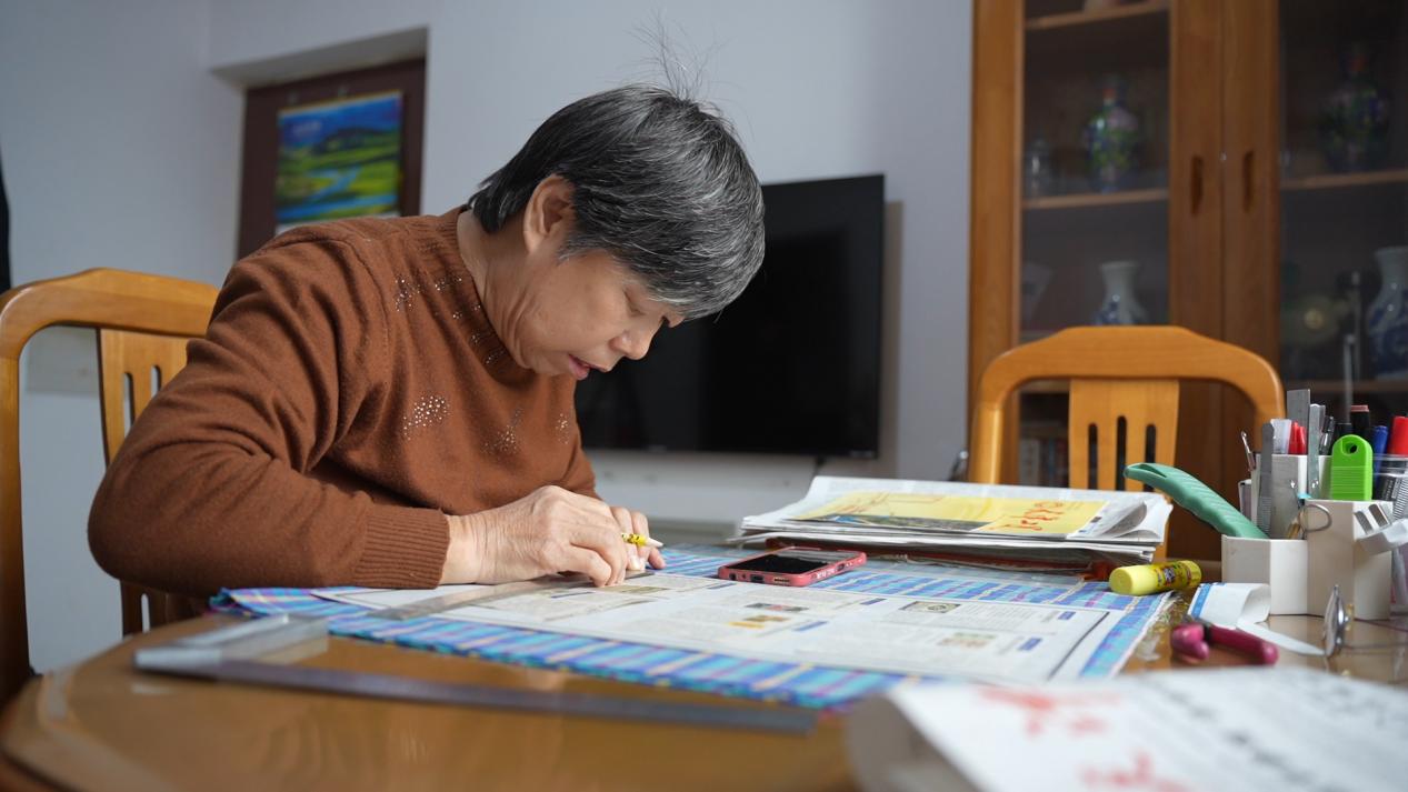 居民王兰一直热衷剪报活动,她的剪报内容既有国家改革开放、党的建设,也有传统文化题材。之前一直在自家写字台上操作,随着作品篇幅不断增大,小小的写字台显得愈发局促。王兰说:“我一直想做一个10米的剪报长卷,但是家里实在是施展不开。”