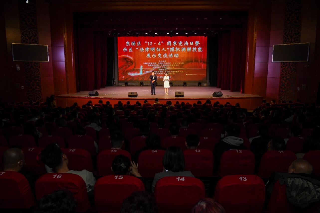 12月4日,东丽区举办“12・4”国家宪法日暨社区 “法律明白人” 模拟调解技能展示交流活动,以情景剧演绎为载体,生动展现基层法治建设成效,推动宪法精神在全区落地生根。区委常委、区委政法委书记李长凯出席活动。 现场,《小院鸡鸣》中邻里诉求的巧妙平衡、《调解的力量——电梯风波》里权责边界的依法厘清、《社区调解室的亲情修复师》中情法交织的温柔化解......一个个贴近生活的剧情,一场场真实鲜活的演绎,让观众沉浸式感受调解工作的情理温度与法理智慧。