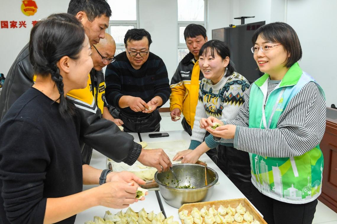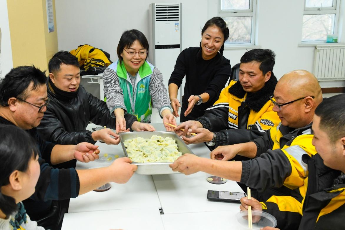 现场,志愿者们早早备好面团、馅料,与外卖骑手、快递小哥们围坐在一起擀皮、包馅。一盘盘热气腾腾的饺子新鲜出锅,浓郁的香气弥漫开来,大家品尝着亲手包的饺子,脸上洋溢着幸福的笑容。志愿者们不忘叮嘱大家,户外奔波时要注意交通安全、做好防寒保暖。