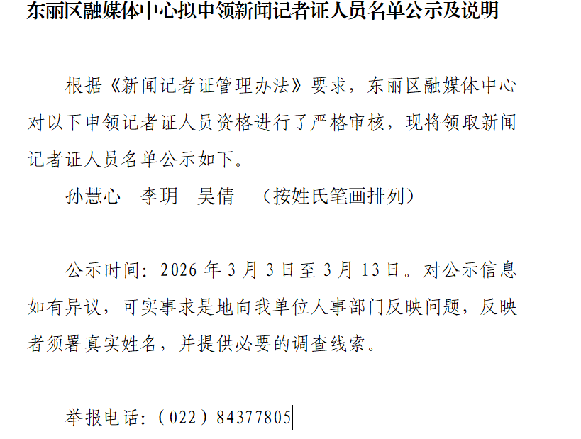 东丽区融媒体中心拟申领新闻记者证人员名单公示及说明